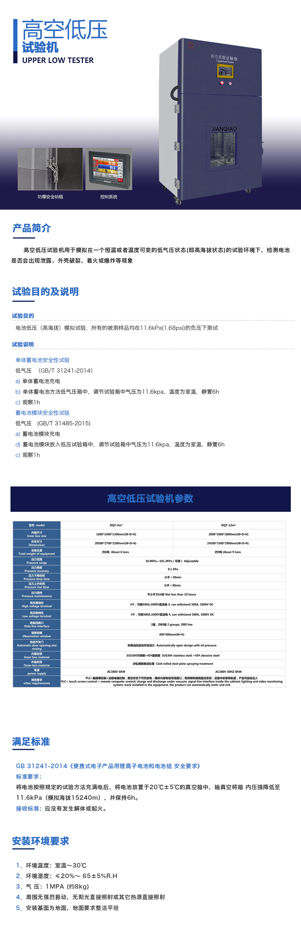 產品型號:JQ-8104(可定制) 品牌:劍 喬 用途:高空低壓試驗機用于模擬在一個恒溫或者溫度可變的低氣壓狀態(即高海拔狀態)的試驗環境下,檢測電池是否會出現泄露、外殼破裂、著火或爆炸等現象。咨詢熱線:13829135130