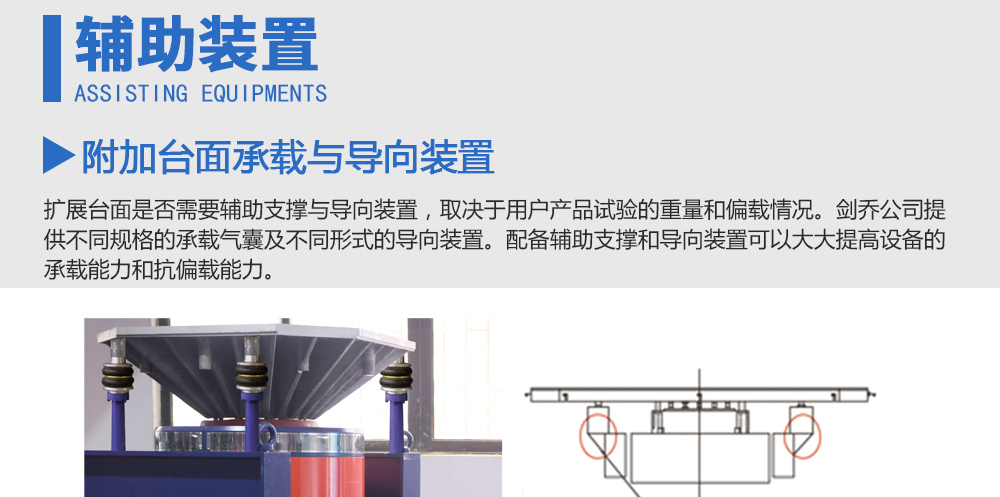 產品型號: 品牌:劍 喬 用途:擴展臺面是否需要輔助支撐與導向裝置,取決于用戶產品試驗的重量和偏載情況。劍喬公司提供不同規格的承載氣囊及不同形式的導向裝置。配備輔助支撐和導向裝置可以大大提高設備的承載能咨詢熱線:13829135130